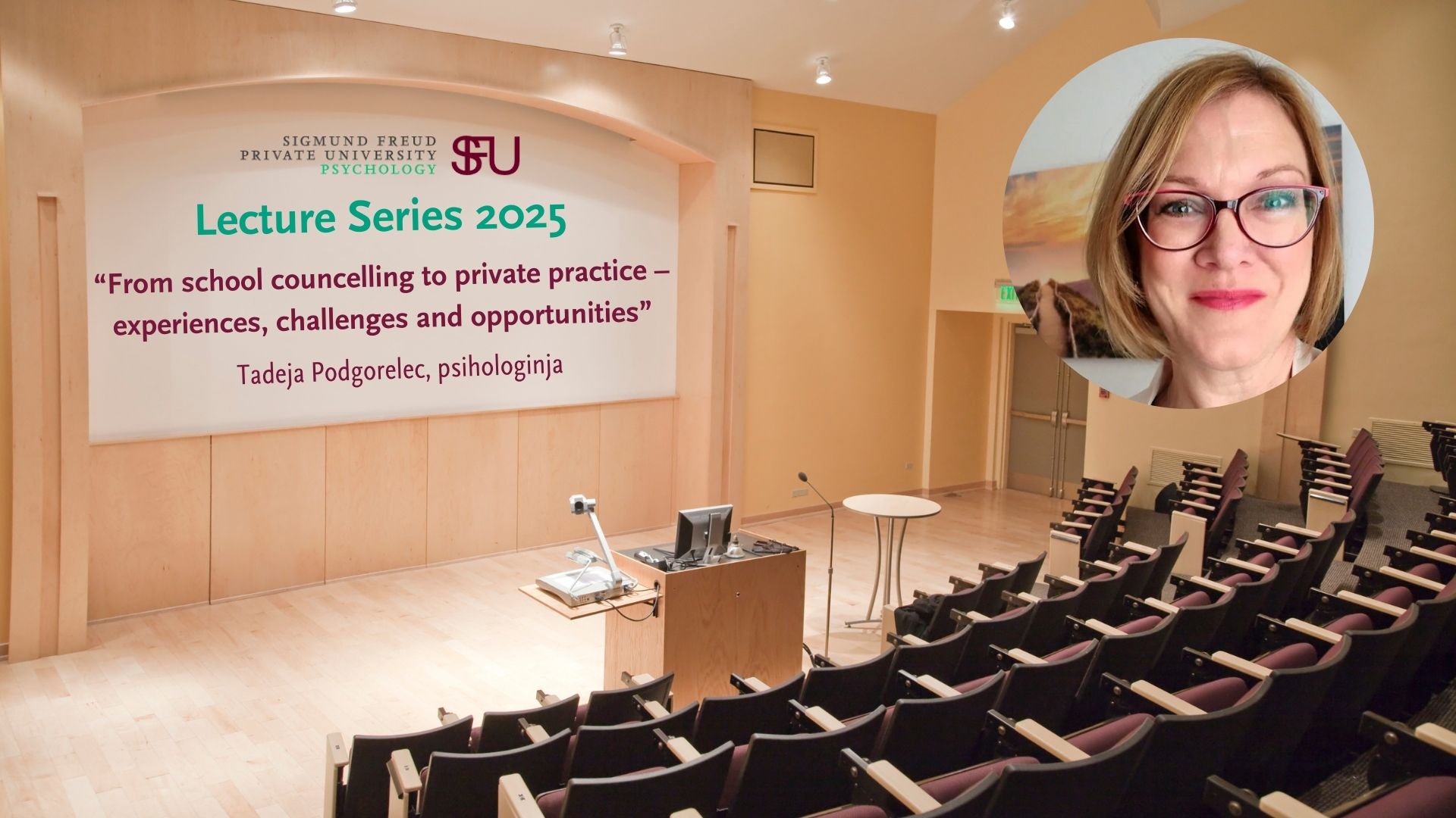 Prvo predavanje: "From school councelling to private practice – experiences, challenges and opportunities" (Psihološka podpora – od šolskega svetovanja do zasebne prakse: izkušnje, izzivi in priložnosti)