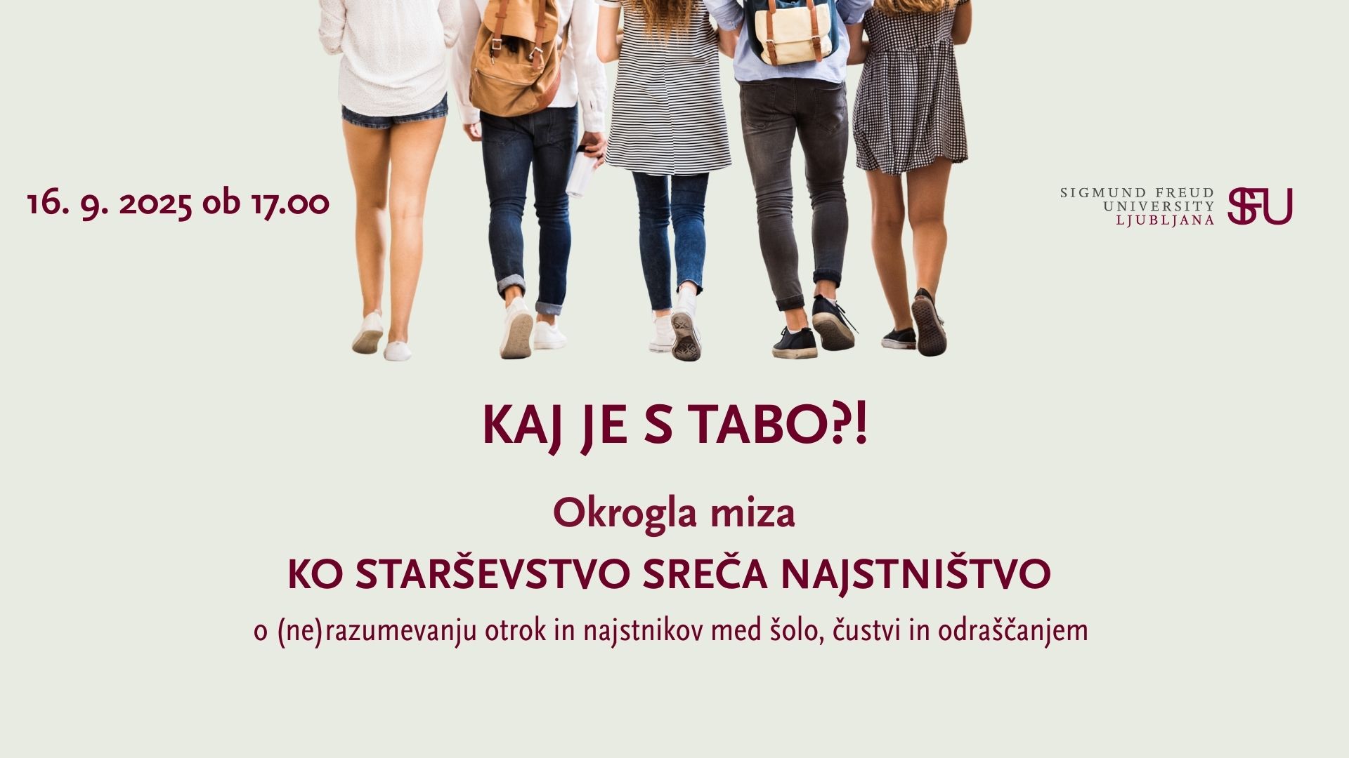 V seriji dogodkov na temo duševnega zdravja Kaj je s tabo?! vas v septembru ponovno vabimo na okroglo mizo, tokrat z naslovom Ko starševtsvo sreča najstništvo: o (ne)razumevanju otrok in najstnikov med šolo, čustvi in odraščanjem. Na dogodku bomo skupaj z vrhunskimi strokovnjaki odpirali vprašanja, ki jih prinašajo šola, razvojne spremembe in odnosi v družini. Pogovarjali se bomo o tem, kako graditi zaupanje, spodbujati notranjo motivacijo ter prepoznavati otrokove čustvene potrebe, tudi takrat, ko jih otrok sam ne zna ubesediti.