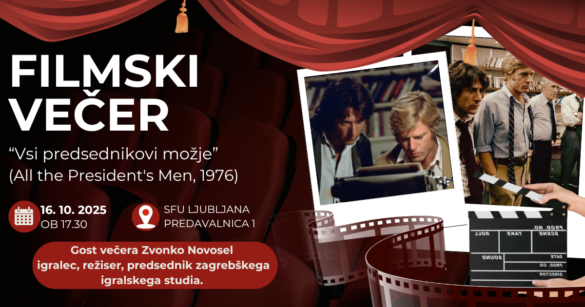 Tokratni večer bo posvečen spominu na velikega igralca, režiserja in političnega aktivista Roberta Redforda, ki je septembra letos preminil. Dogodek bo združil pogovor o Freudovem pogledu na dramsko igro in ogled znamenitega filma Vsi predsednikovi možje – v razmislek o psihološki moči igre, čustev in resnice.