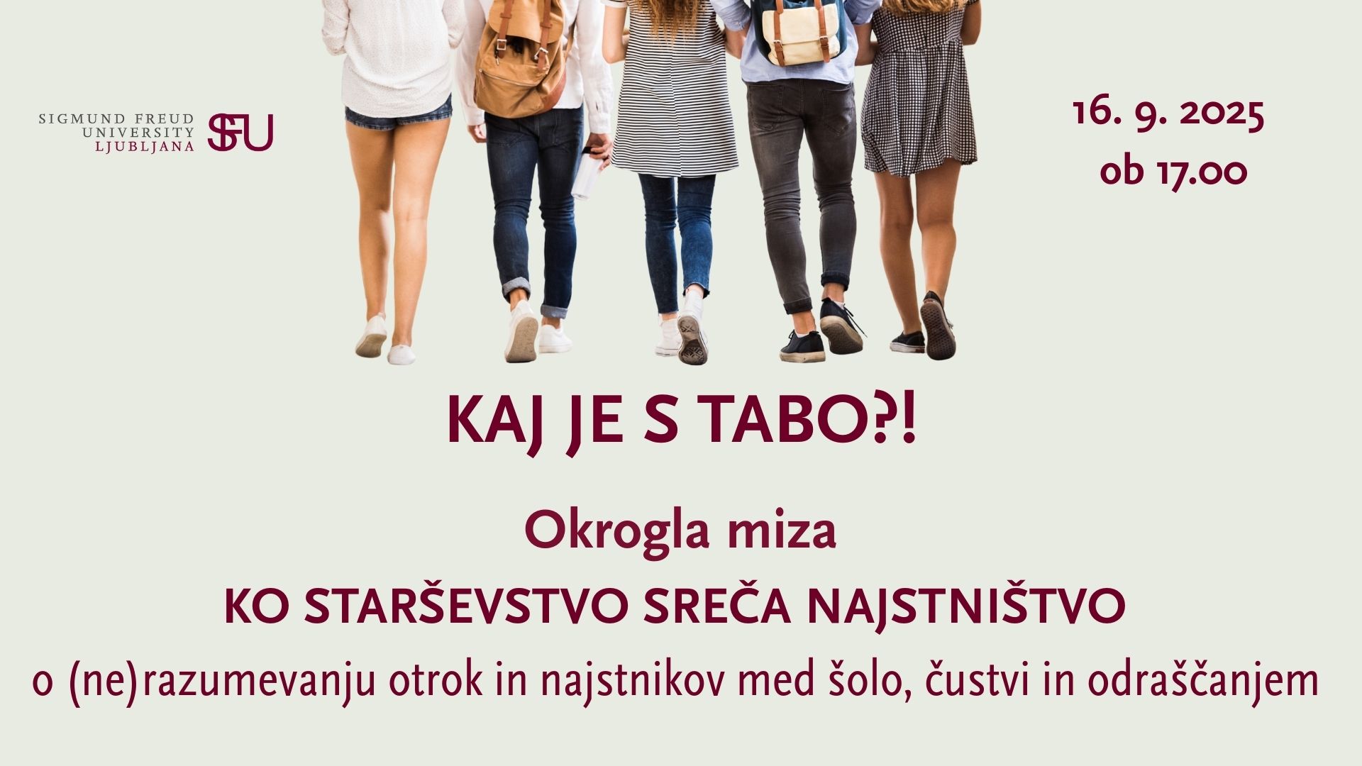 V seriji dogodkov Kaj je s tabo?! vas v septembru vabimo na okroglo mizo z naslovom Ko starševstvo sreča najstništvo: o (ne)razumevanju otrok in najstnikov med šolo, čustvi in odraščanjem.