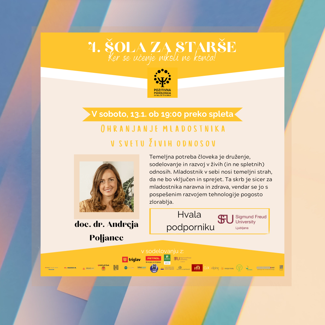 Vabljeni, da se nam v soboto, 13. januarja 2024 ob 19.00 pridružite na strana Pozitivna psihologija za boljše življenje, kjer bo dr. Andreja Poljanec v sklopu 4. Šole za starše, spregovorila o tem, kako razvijati in ohranjati žive odnose z mladostnikom. Po predavanju bo predavateljica odgovarjala na vaša vprašanja.