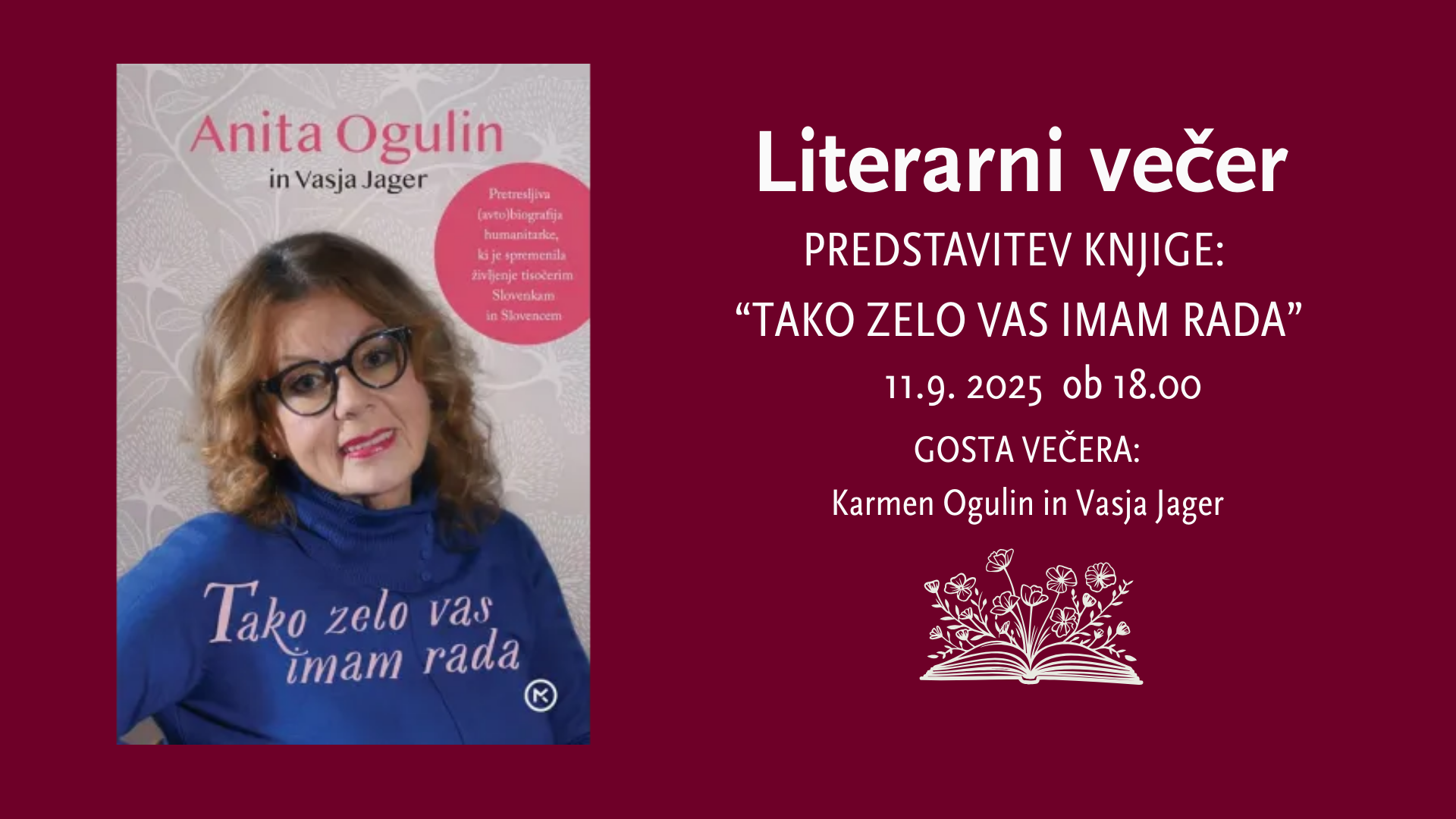 Prvi večer bo posvečen ganljivi knjigi “Tako zelo vas imam rada” avtorjev Anite Ogulin in Vasje Jagra – delu, ki razpira vprašanja o sočutju, otroštvu, socialnih stiskah in človeški povezanosti. Knjigo bosta predstavila soavtor Vasja Jager in hči avtorice, Karmen Ogulin, ki bo z nami delila osebni vpogled v življenje in poslanstvo Anite Ogulin. Skupaj bosta osvetlila zgodbo ženske, ki je svoje življenje posvetila pomoči otrokom v stiski.