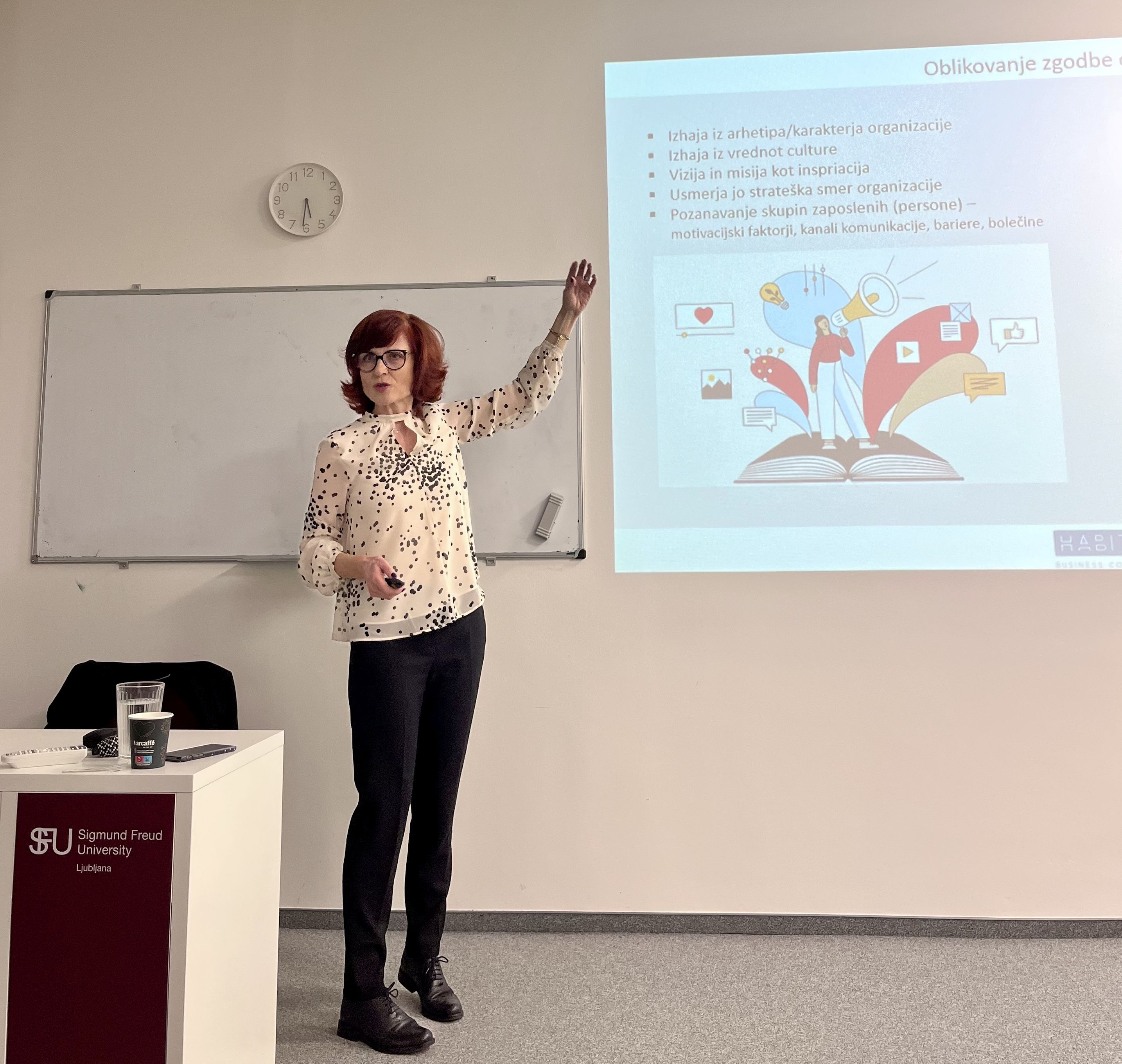 Ob začetku predavanja je bila predstavljena organizacija kot živi organizem, prikazala je vrste in pomen komunikacije do kupcev in do zaposlenih. Poudarila je prednosti dobre komunikacije, dodatno povezala s potrebnim razumevanjem komuniciranja različnih generacij, ter zaključila s pogostimi razlogi nerazumevanja in nejasnosti komunikacije v poslovnem svetu. V osrednjem delu je predstavila vlogo marketinga in HR oddelkov pri komunikaciji v vsaki organizaciji. Študentje so spoznali pomen komunikacije blagovnih znamk, tako produktnih in storitvenih, kot tudi znamke delodajalca. Spoznali so pomen koncepta blagovne znamke in uporabe Jungove metodologije arhetipov pri oblikovanju blagovnih znamk. Sprehod skozi svet blagovnih znamk je bil prikazan iz vseh vidikov: oblik verbalne in neverbalne komunikacije, pomena analognih in digitalnih kanalov komunikacije, uporabe različnih formatov komunikacije in pomen vizualnih elementov komunikacije.